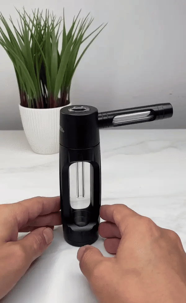 ZenPuff is a transformer. It is designed so the bottom screws onto the top, and the extra glass bowl slides into the top where the glass stem is. This simple setup transforms it from a water bottle into a dry handheld piece in seconds, with no extra tools required
